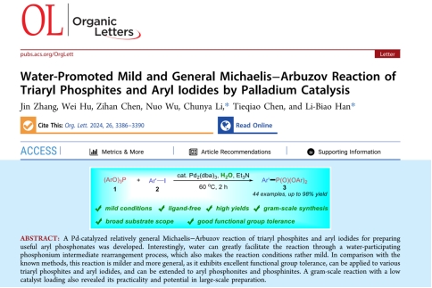 研究进展一:团队负责人以通讯作者的身份在《Organic Letters》上发表题为“Water-Promoted Mild and General Michaelis−Arbuzov Reaction of Triaryl Phosphites and Aryl Iodides by Palladium Catalysis”的研究论文。