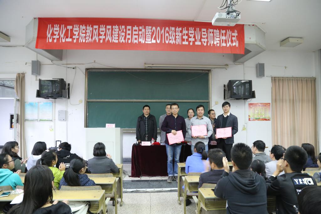 本科新生学业导师的通知》,并分别为2015-2016学年优秀学业导师和2016级新生学业导师颁发了荣誉证书和聘书。聘任仪式结束后,15级老生代表应化151班王志豪同学和16级新生代表化学师范161班胡宁洋同学发言,他们分享了教风学风建设月活动的开展、学业导师制度的实施给同学们带来的帮助,并且呼吁同学们要持之以恒,同时也预祝“教风学风建设月”活动圆满成功。接着2015年优秀学业导师、16级新生学业导师代表郦勇老师发言,他用精炼的语言阐述了他所理解的学业导师,并期待和同学们一起探寻神奇的化学世界。
