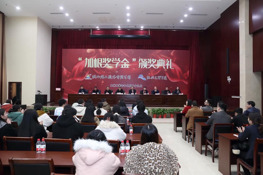 校学工部副部长潘奕羽宣读了表彰决定,荣获2020年“加根奖学金”的30位同学受到了表彰。研究生1801班郑秀同学作为获奖学生代表发言,她表达了对浙江闰土股份有限公司和学校的感谢,分享了自己在读研期间的学习生活情况,表示要不断追求卓越,以期更好地回馈企业与社会。