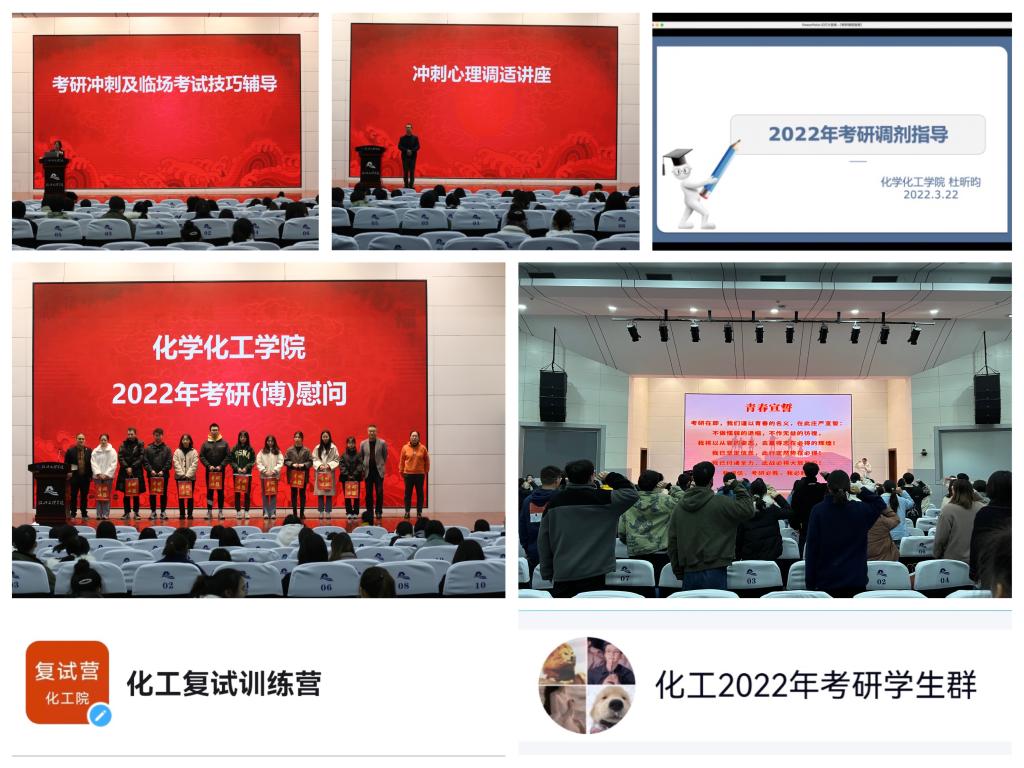 考前30天举行考研(博)誓师大会,开展考前心理疏导讲座,考前经验分享与学习技巧的分享,送上精心准备的学习慰问品和暖心贺卡,发放考研报名费补贴。