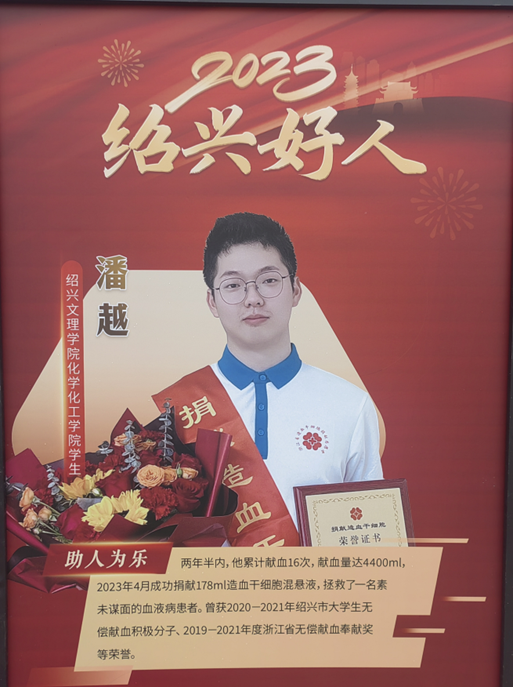 潘越助人为乐,用行动诠释新时代大学生的青春担当。两年半内累计献血16次,献血量达4400ml,先后荣获2020-2021年绍兴市大学生无偿献血积极分子、2019-2021年度浙江省无偿献血奉献奖等荣誉。2023年4月成功捐献178ml造血干细胞混悬液,拯救了一名素未谋面的血液病患者。其事迹先后被中国教育在线、教育之江、绍兴日报、越牛新闻、潮新闻等媒体专题报道。