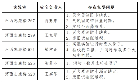 此次盘查旨在通过系统性地审查实验室的各项安全标准执行情况,包括但不限于设备安全性能、化学品存储与管理、电气安全、消防安全以及紧急应对措施的有效性,以期有效预防各类安全事故的发生,维护学院实验环境的稳定与安全。现将本次检查中发现的问题通报如下: