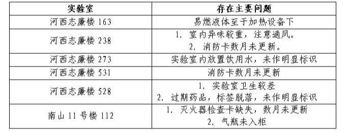国庆假期临近,为扎实筑牢假期开放实验室安全防线,切实保障教学科研资产与师生安全,学院安全检查小组于9月30日前往河西志廉实验楼、南山分析测试中心、脂溶性维生素浙江省工程研究中心、新能源研究所等重点区域,对各教学实验室与科研实验室开展全面检查。本次检查聚焦危化品储存与使用规范、消防设施有效性、过期药品处置、固液废弃物分类、实验室环境卫生等关键环节。经过认真检查和评估,安全小组发现少量问题和不足,现将存在问题的实验室进行通报并限期整改。